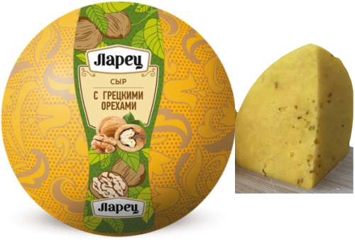Сыр Ларец с грецкими орехами это будоражащее сочетание сыра и, уникального по своей природе, грецкого ореха. Консистенция сыра, нежная и пластичная, рисунок на разрезе ажурный, состоит из угловатых глазков с россыпью дробленого грецкого ореха. Терпкость и аромат грецких орехов отлично оттеняют нежный, сливочный вкус сыра, а также питательность орехов придаст хорошее настроение на целый день.