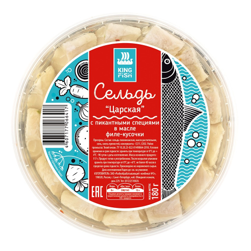 Сельдь ф/к в масле специи Царская 180гр (5шт) King Fish РФ - заказать можно через сайт или контактный центр по выгодной цене с персональными скидками и акциями для оптовой закупки. Бесплатная доставка продуктов осуществляется по Санкт-Петербургу и Ленинградской области в удобное время, в офис, склад, магазин, или ресторан. Стоимость и возможность бесплатной доставки зависит от времени суток, дня недели, области, текущих акций и размера покупки.
