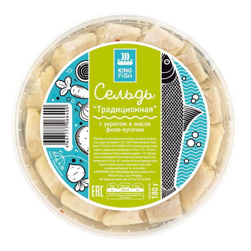 Сельдь ф/к в масле укроп Традиционная 180гр (5шт) King Fish РФ - заказать можно через сайт или контактный центр по выгодной цене с персональными скидками и акциями для оптовой закупки. Бесплатная доставка продуктов осуществляется по Санкт-Петербургу и Ленинградской области в удобное время, в офис, склад, магазин, или ресторан. Стоимость и возможность бесплатной доставки зависит от времени суток, дня недели, области, текущих акций и размера покупки.