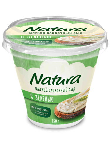 Сыр Natura мягкий сливочный с зеленью ароматное сочетание зелени, натурального молока и сливок. В составе сыра Natura нет ароматизаторов, консервантов и красителей.